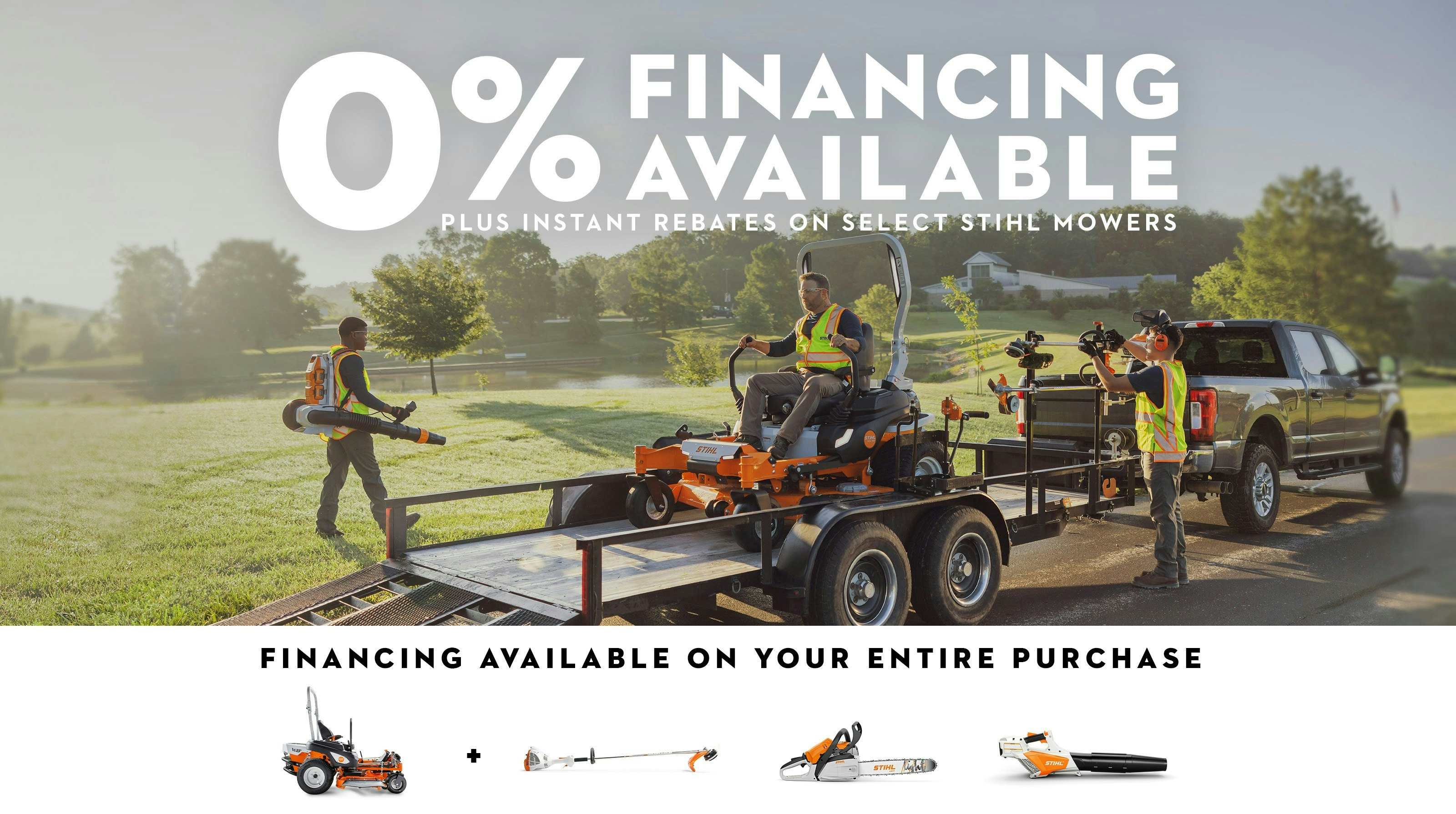 *Financing programs are offered by Sheffield Financial, a division of Truist Bank. Member FDIC. Subject to credit approval. Approval, and any rates and terms provided, are based on credit worthiness. Other financing offers are available. See your local dealer for details. Rate advertised is based on minimum bureau risk score of 660. Minimum amount financed $400 for Push and Zero-Turn mowers and $5,000 for STIHL Handheld Products; Maximum amount financed $75,000. Other qualifications and restrictions may apply. Offer effective on eligible and qualified units purchased from a participating dealer. See dealer for product eligibility and qualifications between 8/1/2025 and 10/31/2025. The advertised promotion includes an Origination Fee which has been added to the Amount Financed in the amount of $50.00. Offer subject to change without notice. Available at select STIHL Dealers. ©2025 STIHL